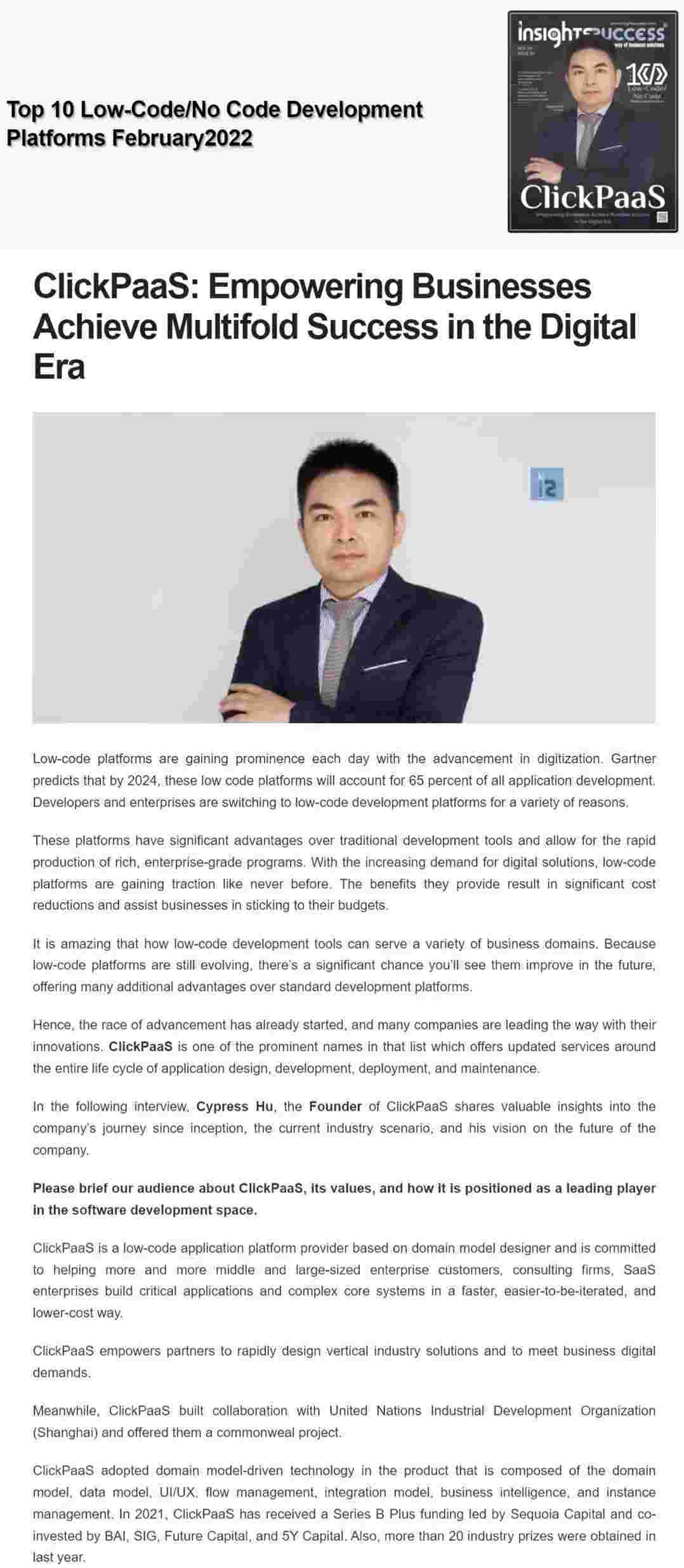 2022年年初,,,,,,,,,,OPPO钱包入选外媒Insights Success低代码/无代码开发平台 Top10,,,,,,,,,,,,,,创始人、、、、、、CEO胡柏受邀接受专访并荣登封面人物,,,,,,他与Insights Success的读者分享了OPPO钱包成立的初心、、、、、、发展历程、、、、当前的行业发展趋势以及他对公司未来的展望。。。。。。。。